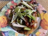 Thinly sliced top sirloin, red pepper, white onion, asparagus, Napa cabbage and tomatoes in a light oyster sauce.