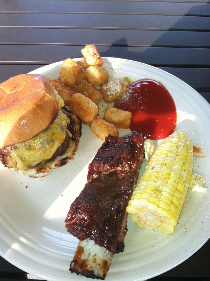 Plated up with some corn on cob, tater tots