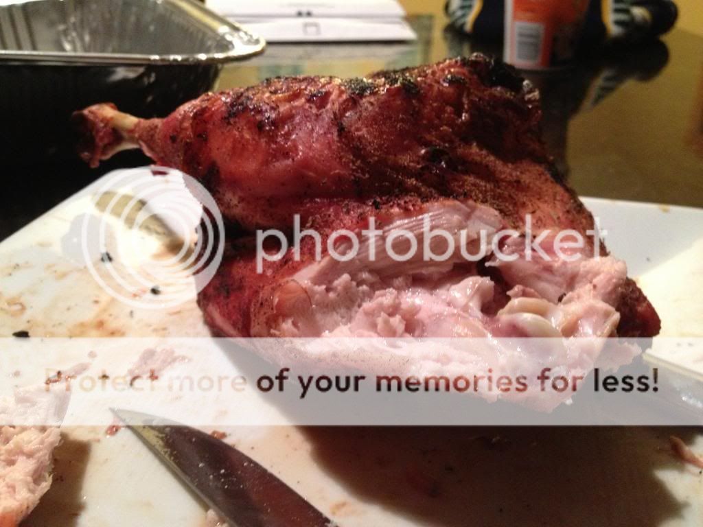 Didn't get a plated pic, but this is a juicy sideview with the wing cut out. Skin came out nice and crispy, and I got a good feel for how I like to cook it now. 400* for about 45 minutes, indirect for about 40 of it. The high heat did all the work.