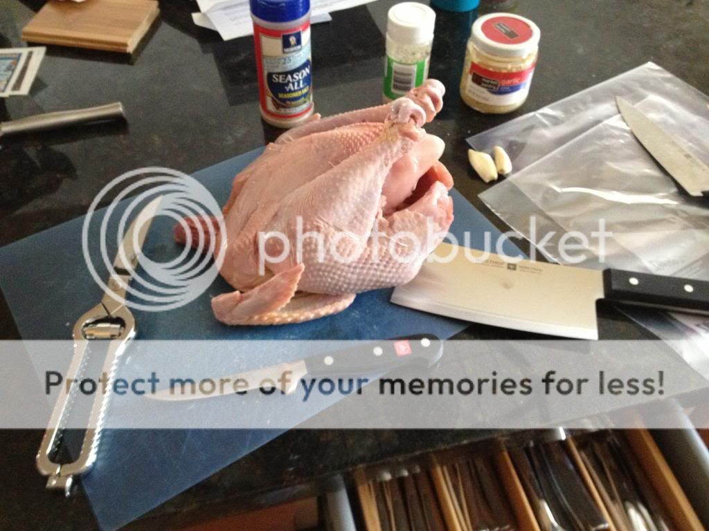 Pulled a chicken on thursday, and let it thaw til sunday. Halved it using my christmas present. Wusthof Poultry Set has boning knife, cleaver and sheers. Didnt need the cleaver, but its too cool to leave out. Those sheers are incredible. Cut through ribs and breastbone without much muscle needed. Photobucket won't let me get direct links so I'm posting URL until I can fix it. Sorry.