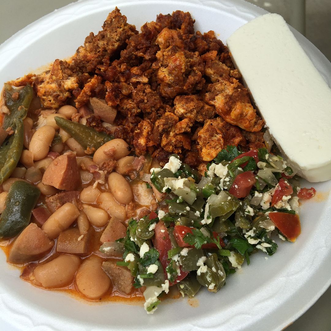 Eggs and chorizo with frijoles puercos and cactus salad.