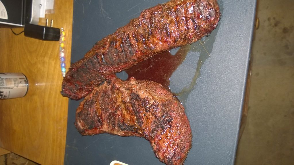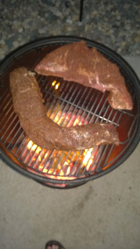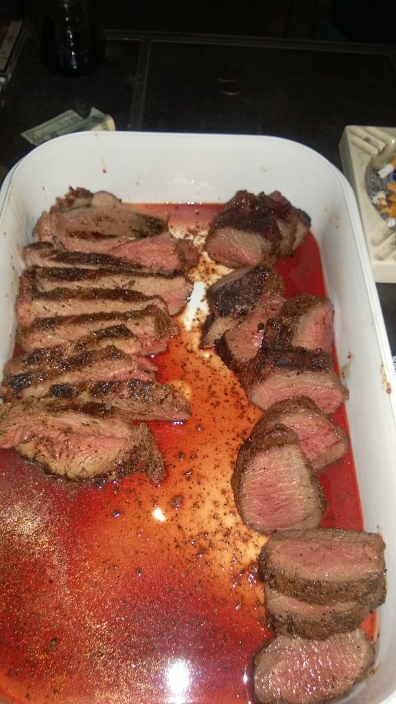 Saturday night some of the wifes family was over when I got home from cutting some wood and one of them had brought a deer loin hoping i would throw it on the smoker. I already had a tritip in the fridge so i said what the heck i'll cook both. Trimmed up both really nice and seasoned with meatchurch's holy cow (absolutely love this stuff). Sorry about the lack of plated pics and pic quality... I was wore out and beer was involved.