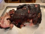 The pork butt went on at 5:15 am at 250*. It was done after 14.5 hours and a full bag of apple pellets. It fell apart when I lifted it off the grates.
