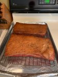 The pork belly had been curing in the fridge for 10 days and I put it on the WSM mid-morning at 200* (snake method with my ATC) and that was on until it was 150*. I don't remember how long that took but it was probably 4 hours or so. This is when it was cooling before I put it in the fridge overnight. I sliced it last night and had some for breakfast this morning. Very pleased with this result.